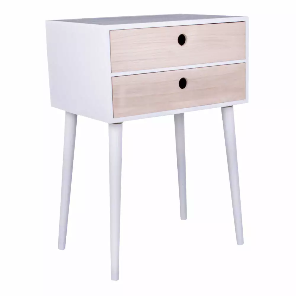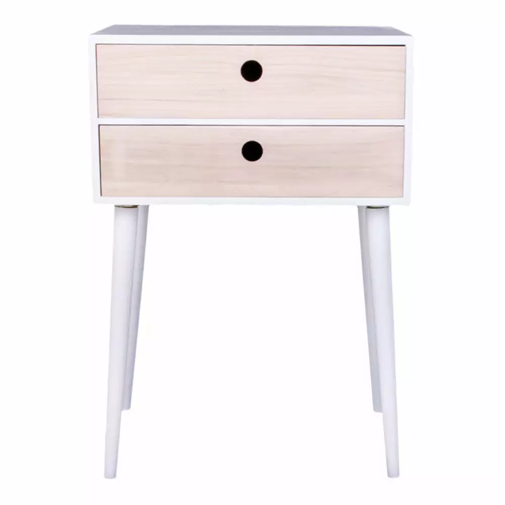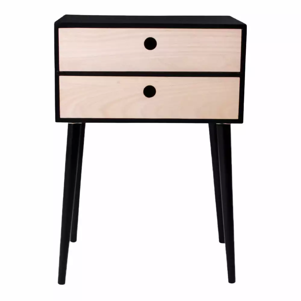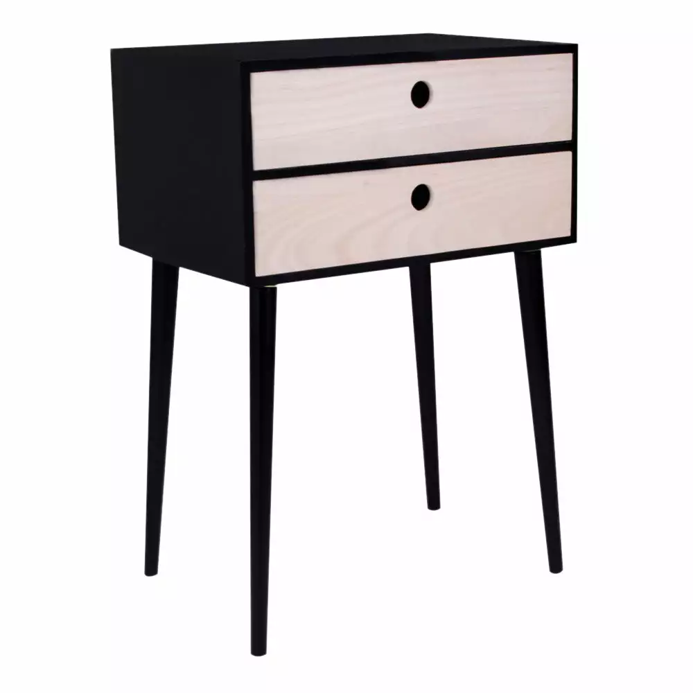 Siro Bella-yöpöytä huokuu muotoilultaan 50-luvun henkeä, mutta modernit väriyhdistelmät tuovat sen tähän päivään. Yöpöydässä on joko musta tai valkoinen runko ja yläosassa on kaksi puunväristä vetolaatikkoa. Laatikoissa on persoonallinen pyöreä reikävedin, joka korostaa kalusteen retrotunnelmaa.