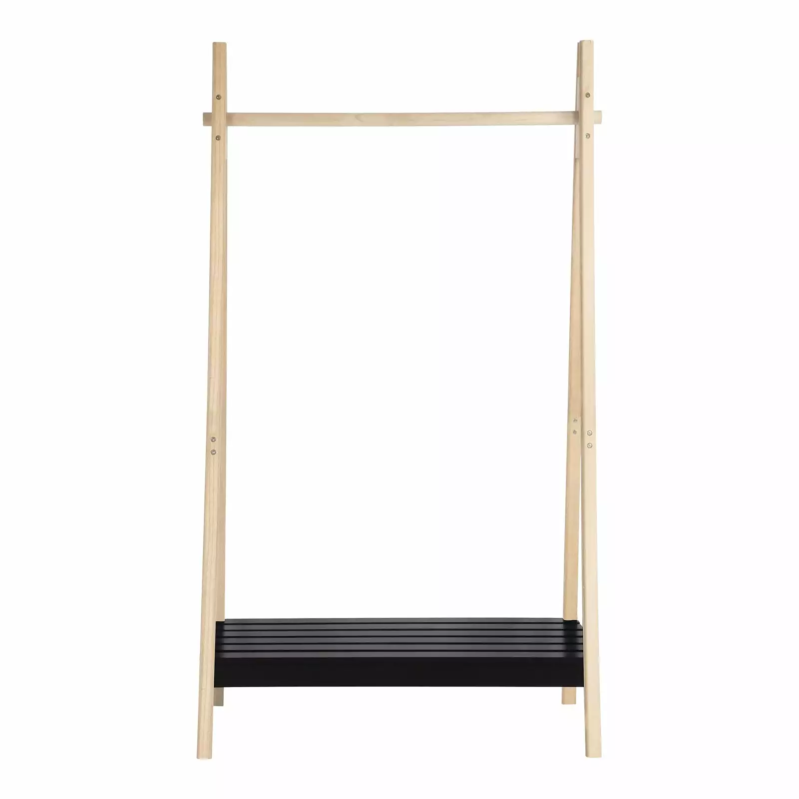 Sisustuksellinen Torino-vaaterekki tuo tarvittavaa lisäsäilytystä vaatteille ja kengille. Vaatetelineen alaosan kenkähylly on maalattu mustaksi. Telineen runko ja vaatetanko on vaaleaa Paulownia-puuta.