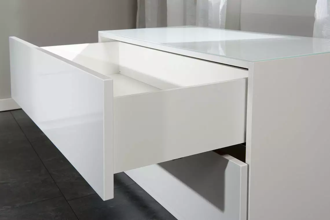 Lumo tuo kotiin ylellisyyttä hohtavan valkoisena. Korkeakiiltomaalatut etusarjat ja valkoiset lasikannet viimeistelevät kalusteet upeasti. Kätevä ’push to open’ -mekanismi tekee käytöstä nautittavan helppoa. Mukana tulee seinään kiinnittämistä varten kaatumisenestonauha, jolla etenkin lapsi- tai lemmikkiperheessä voi turvata huonekalun paikallaan pysymisen.