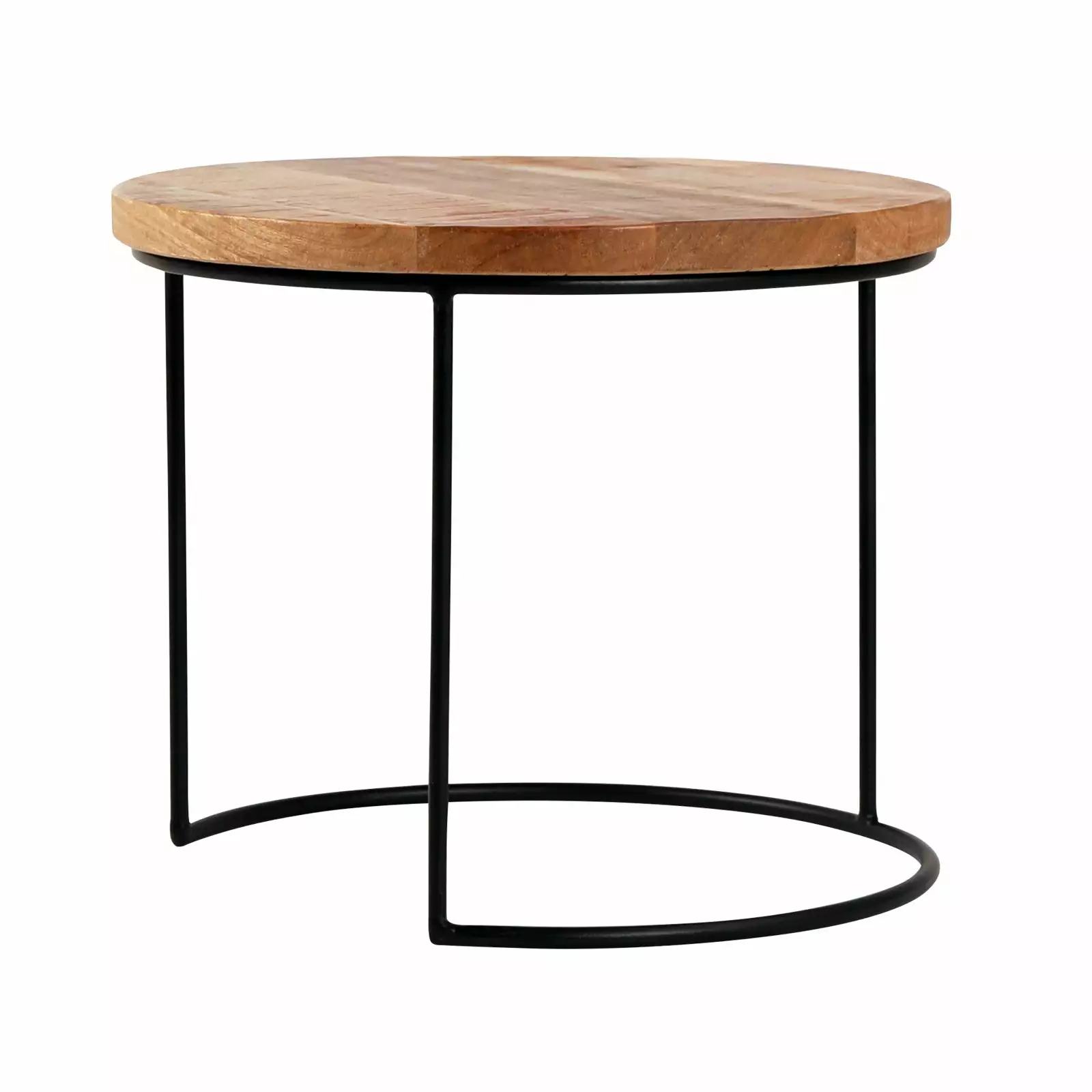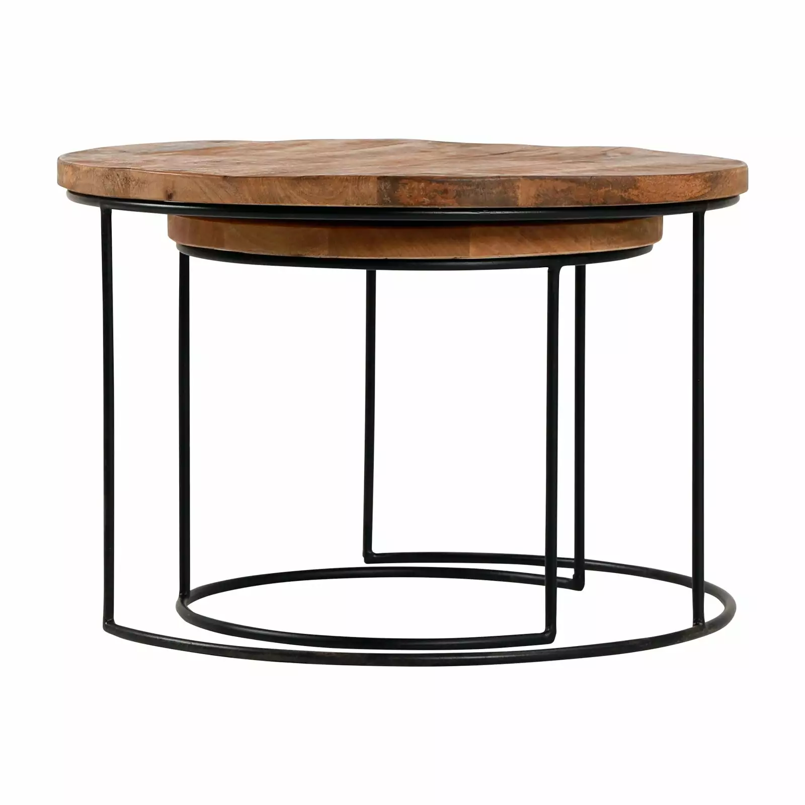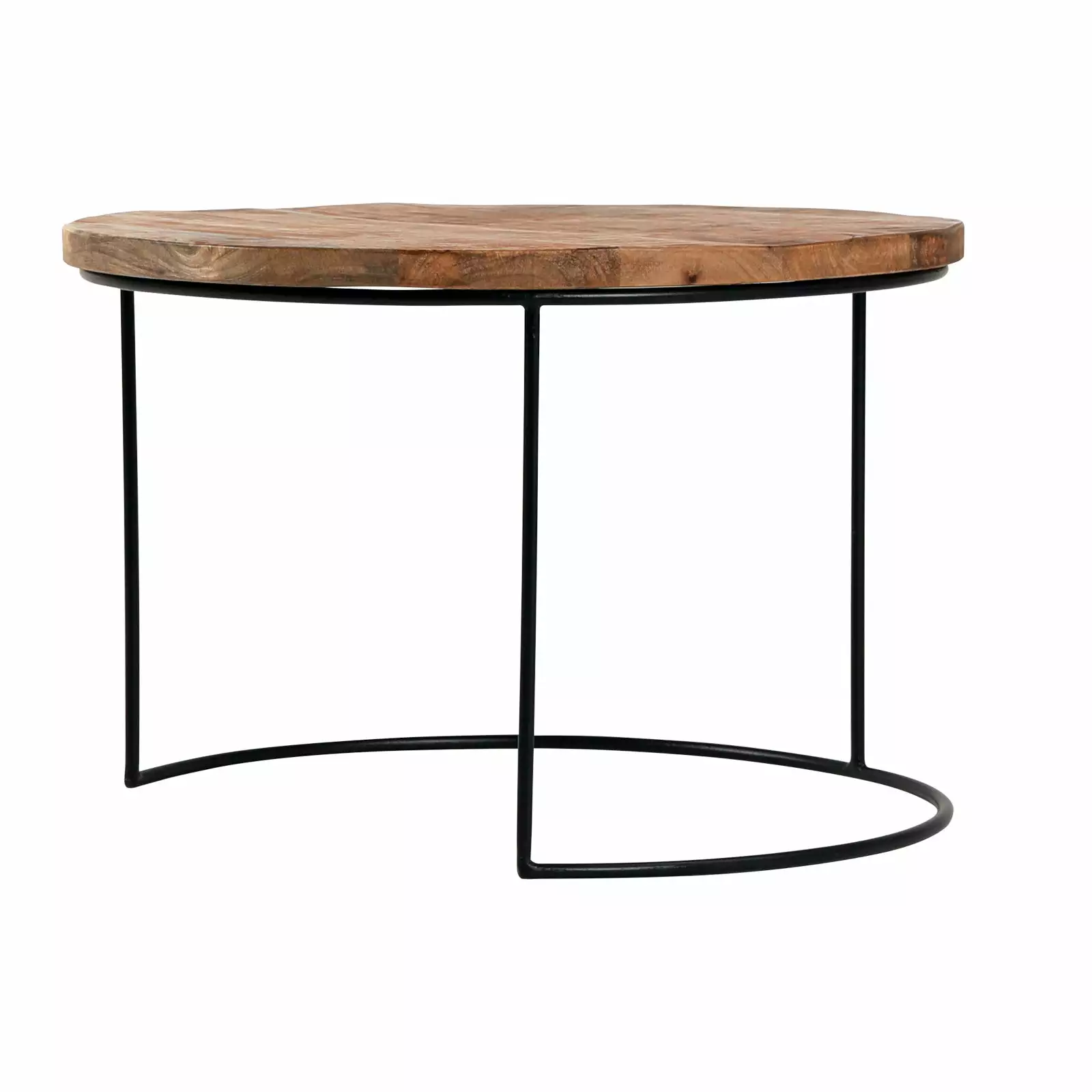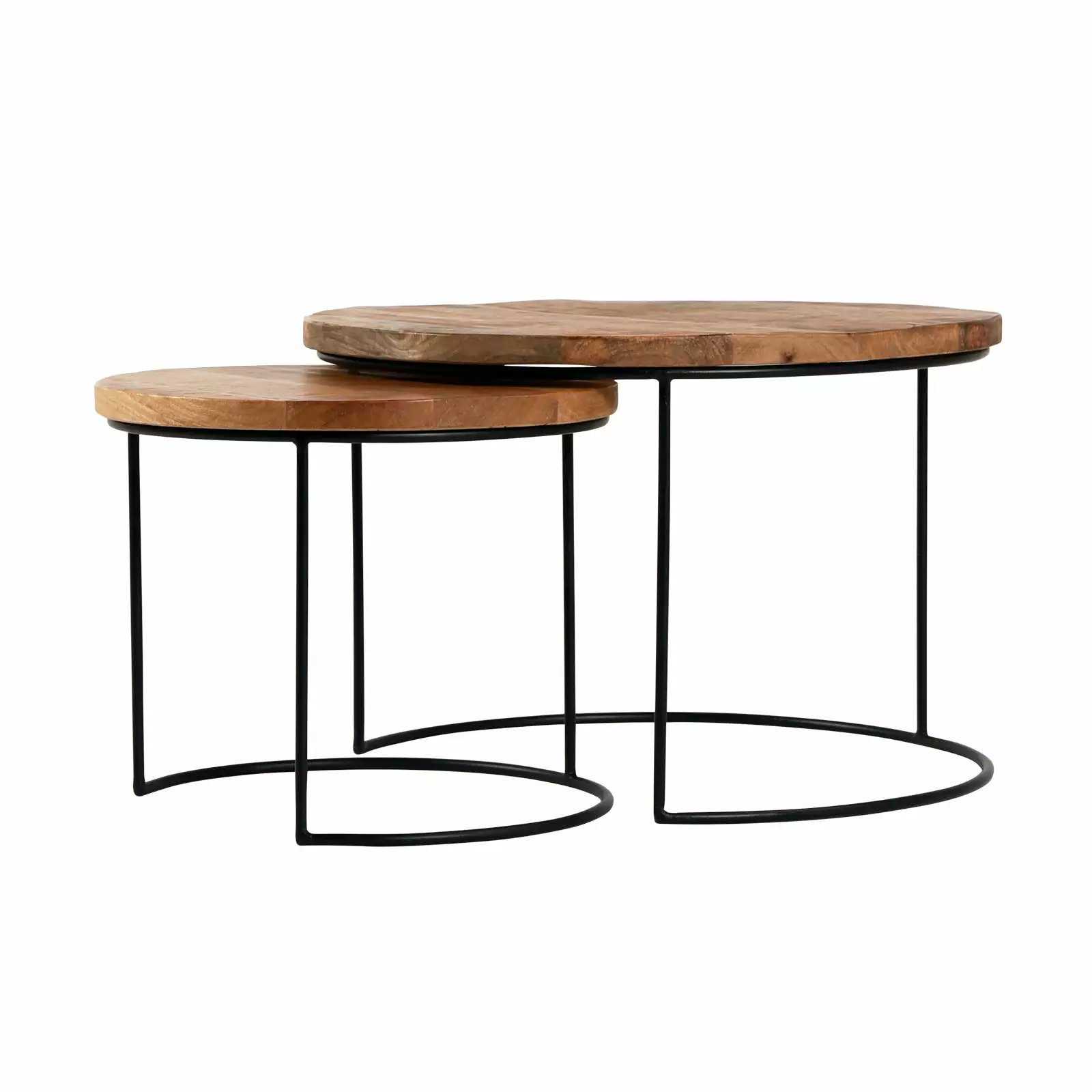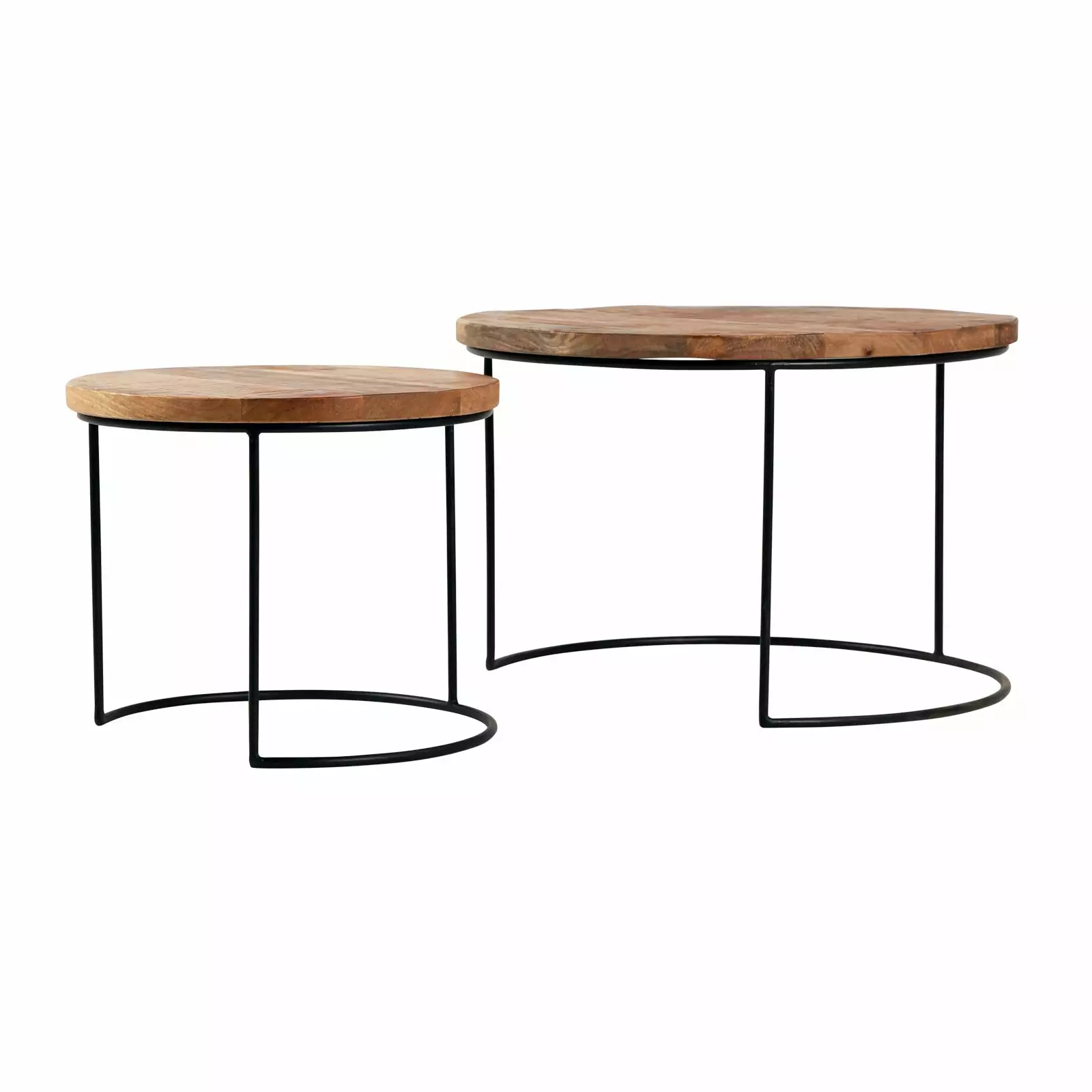 Pyöreäkantisten sarjapöytien sulavalinjainen runko on taivutettu mustasta ohuesta metallista. Yksilölliset puiset kansilevyt ovat kestävää ja rouhean vaikutelman antavaa mangopuuta, joka sisustusmateriaalina huokuu kodikasta lämpöä.