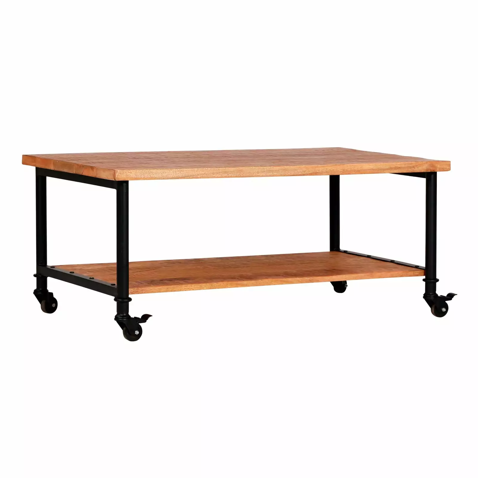 Tunnelmallinen Storage-sohvapöytä tuo eleganttia ilmettä sisustukseen. Monikäyttöisessä sohvapöydässä on mustat metalliset jalat lukittavilla pyörillä. Yksilölliset puiset kansilevy ja alataso ovat kestävää ja rouhean vaikutelman antavaa mangopuuta, joka sisustusmateriaalina huokuu kodikasta lämpöä.
