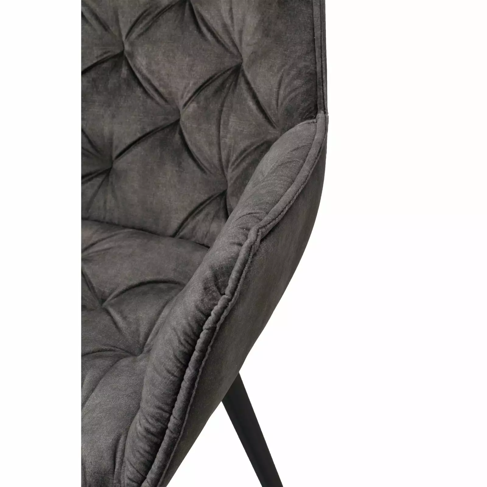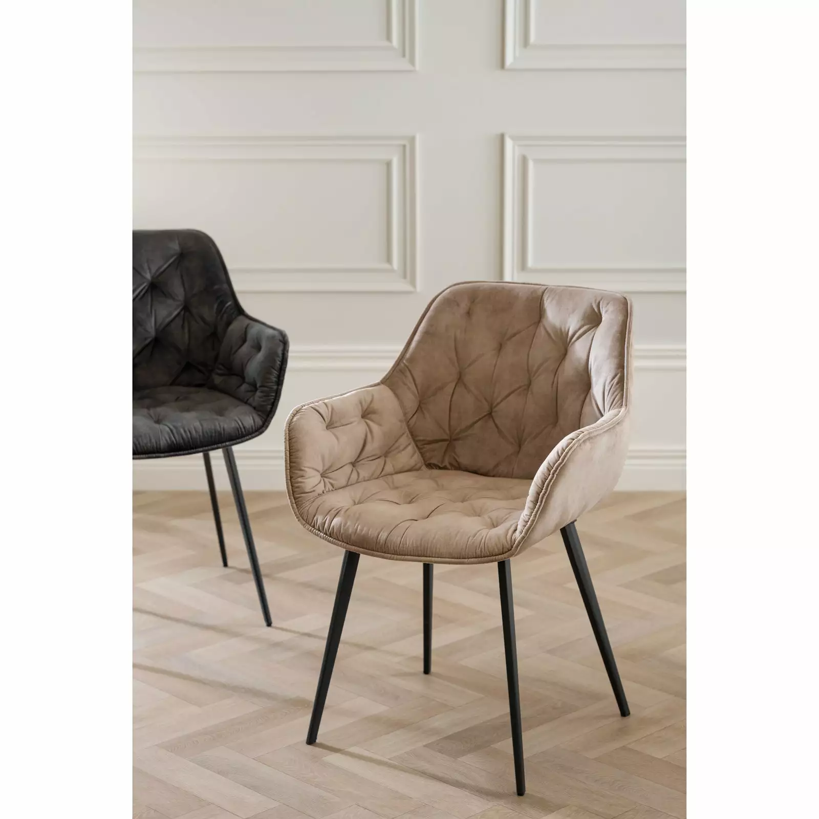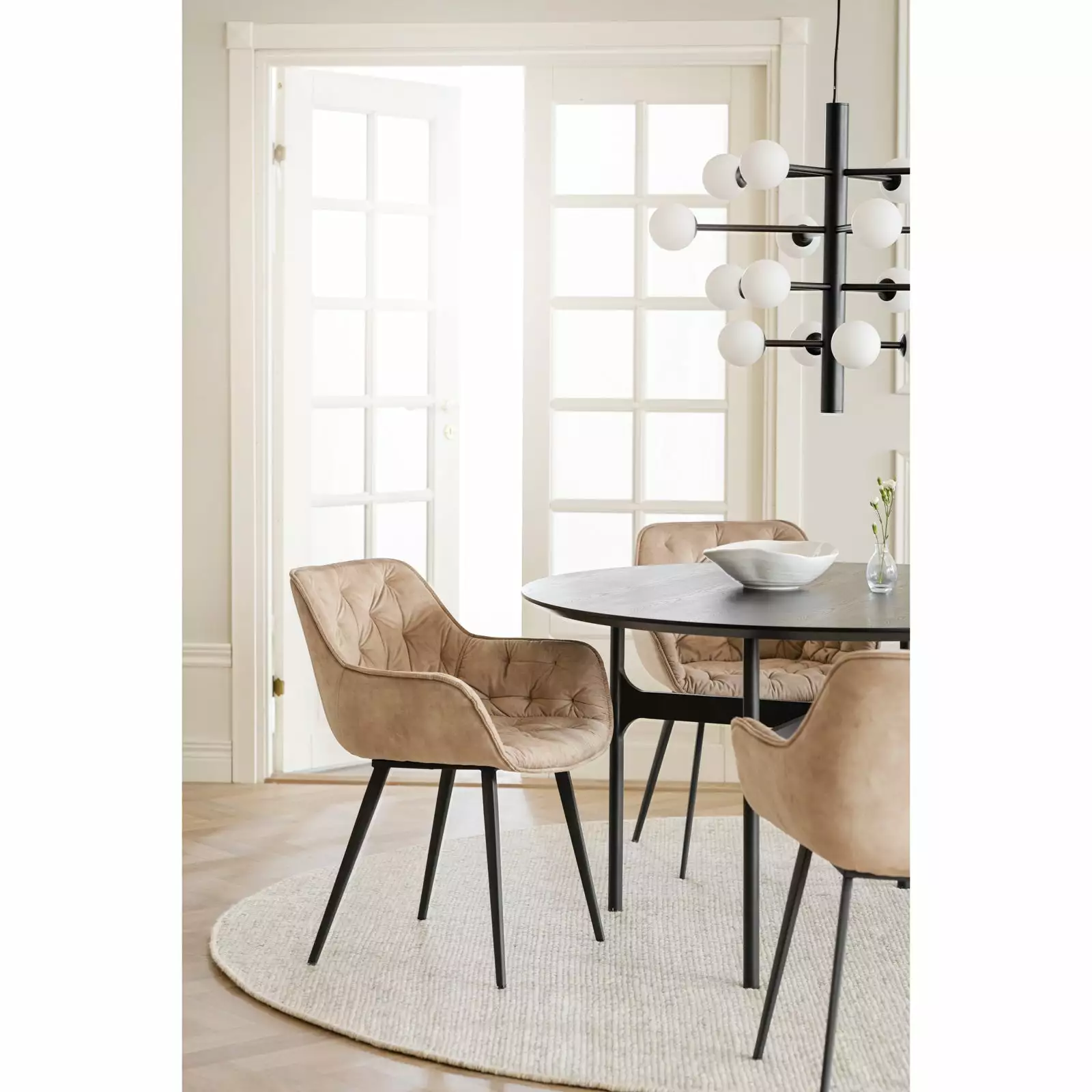 Käsinojallisen Gilroy-tuolin yksityiskohdissa ei myöskään ole säästelty. Tuolin selkänojaa kaunistavat upeat koristetikkaukset, jotka saavat pehmeän samettikankaan näyttämään ylelliseltä. Mustat, kestävät metallijalat viimeistelevät tyylikkään kokonaisuuden. Lisäksi kaikki tuolin puuosat ovat FSC-sertifioitua puuta, joten tuoli on myös vastuullinen valinta.
