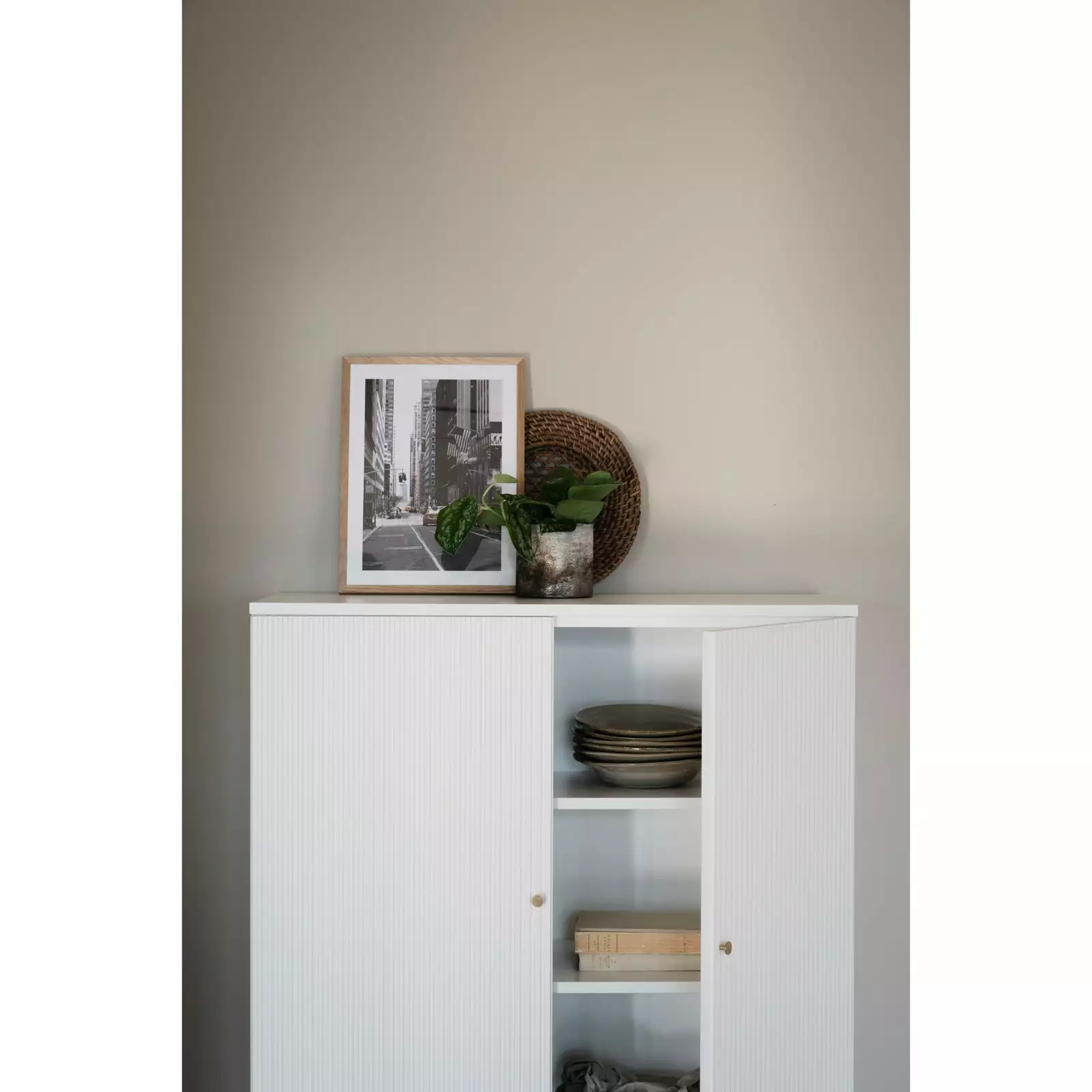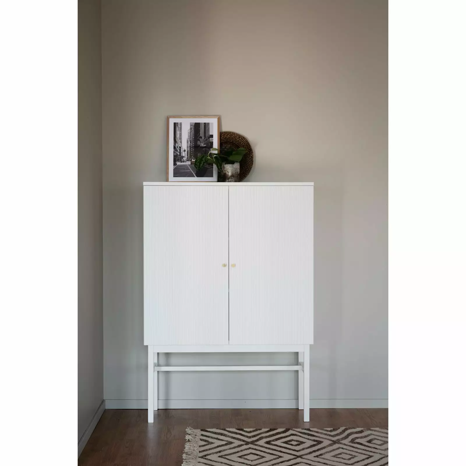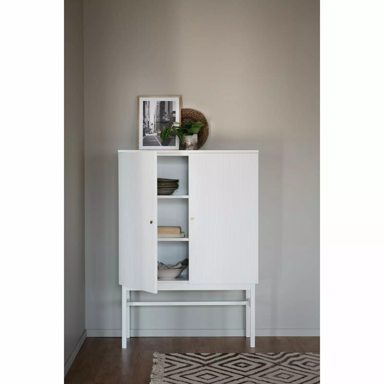 Pelkistetyn tyylikkäässä kaksiovisessa Lewiston-kaapissa on mukavasti säilytystilaa. Lewiston-kaapissa on kauniisti uurretut ovet ja kullanväriset nupit, jotka viimeistelevät kokonaisuuden. Kaapin sisällä on kaksi kiinteää hyllyä ja runsaasti säilytystilaa esimerkiksi astioille ja kodin muille pientavaroille. Ovissa on pehmeästi sulkeutuvat Soft Close-mekanismit, jotka lisäävät käyttömukavuutta.