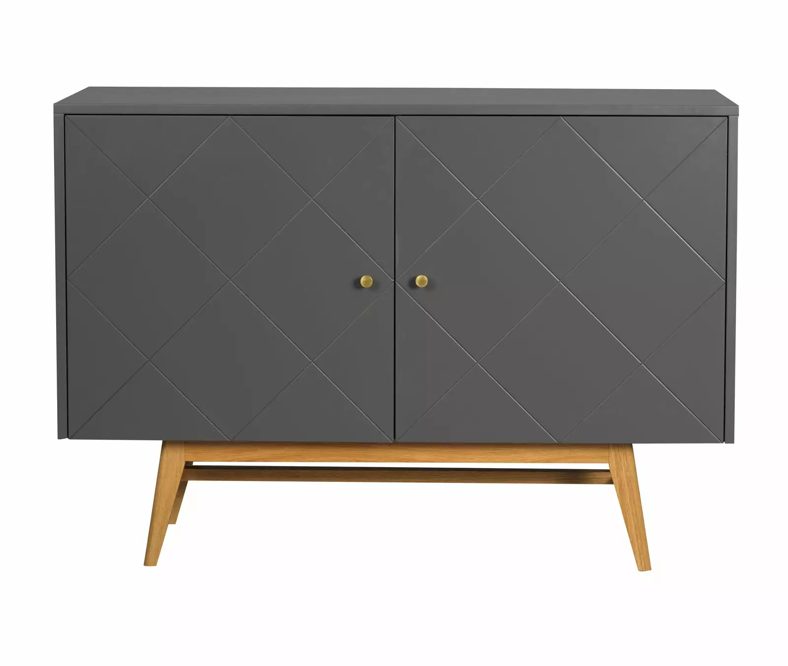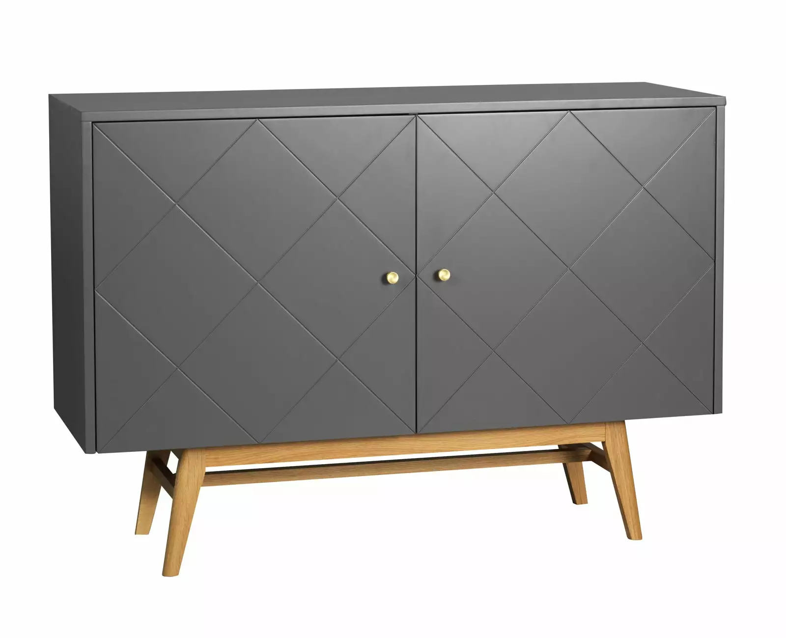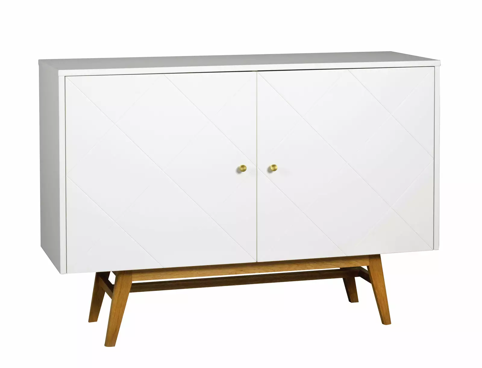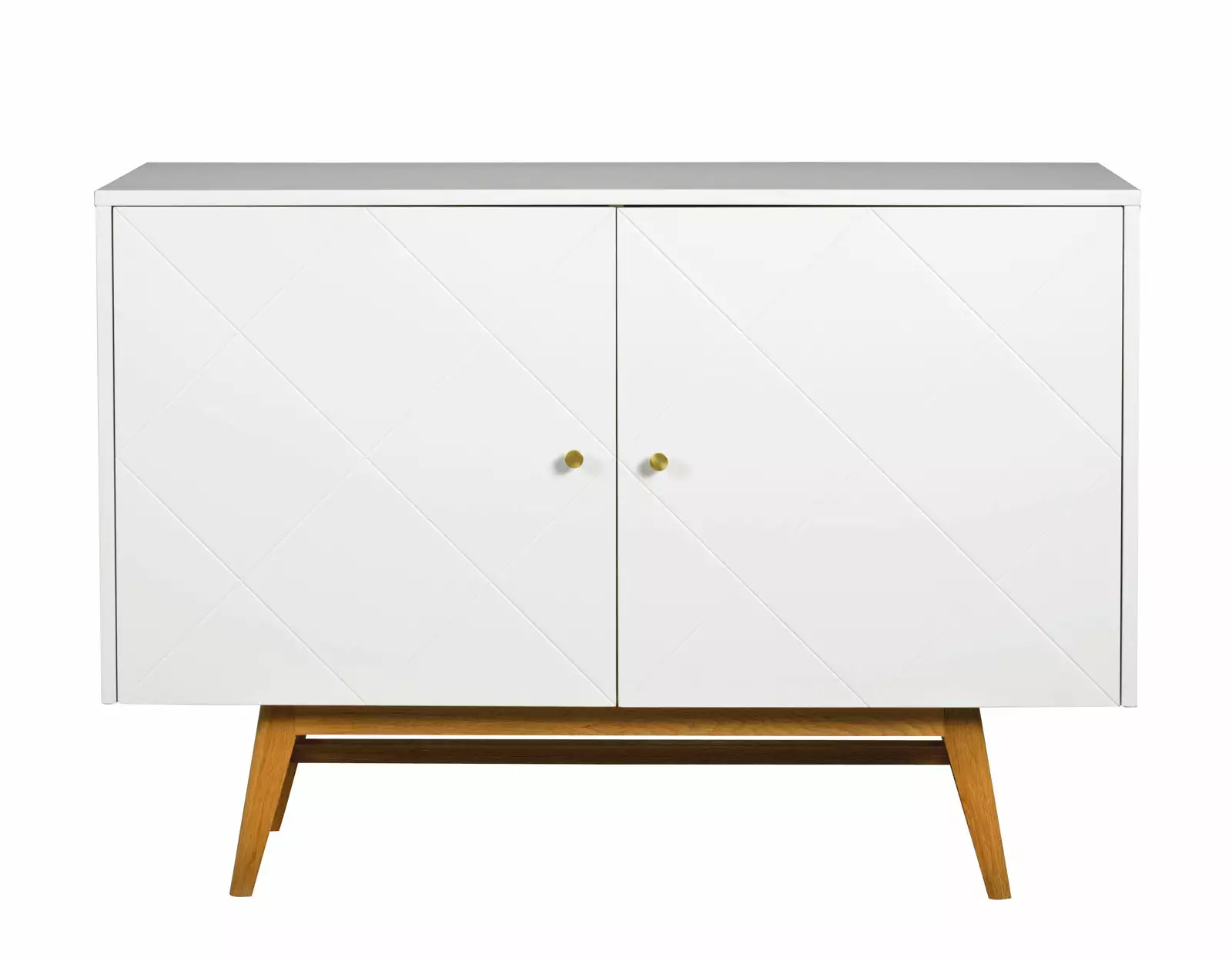 Näppärän sivutason päällä on tasotilaa koristeellisille esineille. Tilavissa kaapeissa on kaksi ovea, joihin on hiottu ruudukkokuvioinen ura koristeeksi ja lisää näyttävyyttä tilaihmeelle tuovat myös kullanväriset metalliset vetimet. Maalatulle kalusteelle kontrastia luovat sen puunsävyiset tammijalat.